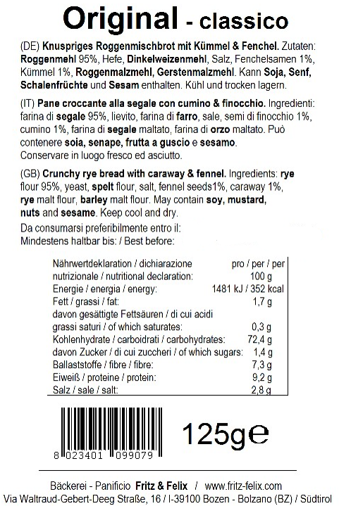 Mini Schüttelbrot Original wird mit der traditionellen Südtiroler Rezeptur hergestellt. Es enthält Kümmel & Fenchel, zwei Gewürze, die für Magen und Darm besonders bekömmlich sind.