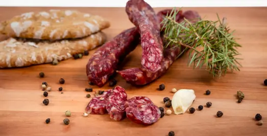 Schweinefleisch, Nitritpökelsalz (Speisesalz, Konservierungsstoff: Natriumnitrit), Dextrose, Gewürze, Zucker, Antioxidationsmittel: Natriumascorbat, Naturdarm, Buchenholzrauch