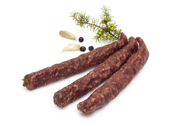 Eigenschaften: Rotbraune trockene Oberfläche, Innen kräftiges, intensives Fleischrot, mit kleinen sichtbaren Fettstückchen.